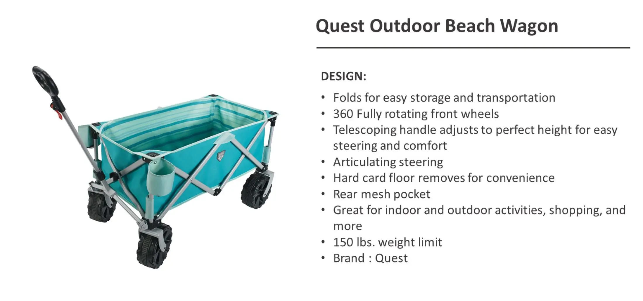 Collected from the entire web and summarized to include only the most important parts of it. The opportunity to be a part of your story is what Quest Outdoors exists for. Models include 4-wheel wagons as well as 2-wheel rolling beach carts depending on your needs.